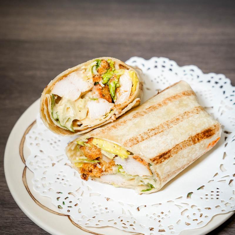 Grilled chicken, romaine lettuce, parmesan cheese, croutons with caesar dressing in a wrap