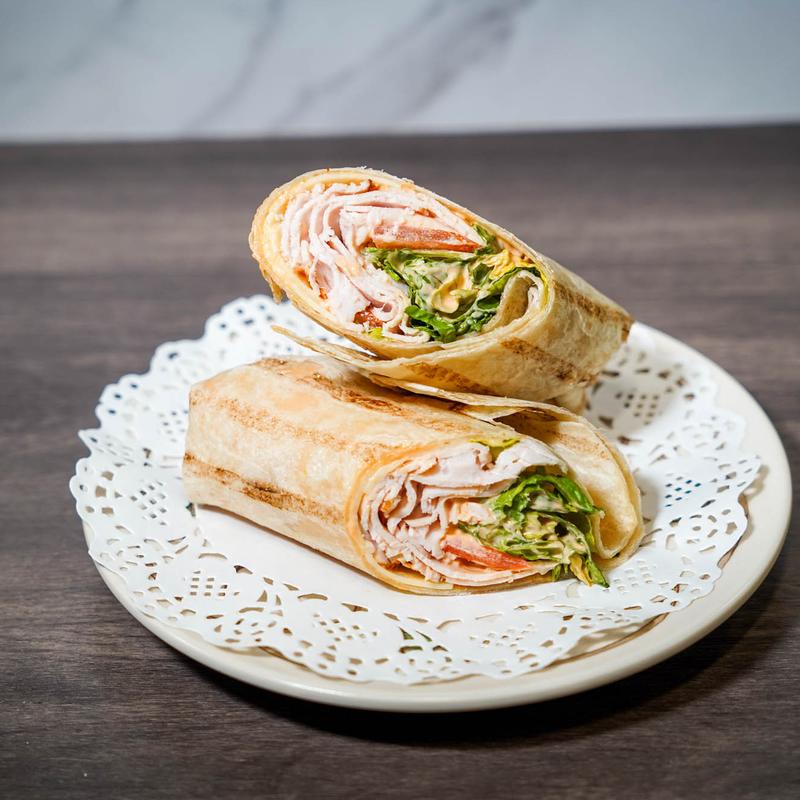 Oven roasted turkey, pepperjack cheese, lettuce, tomatoes, sriracha mayo in a wrap