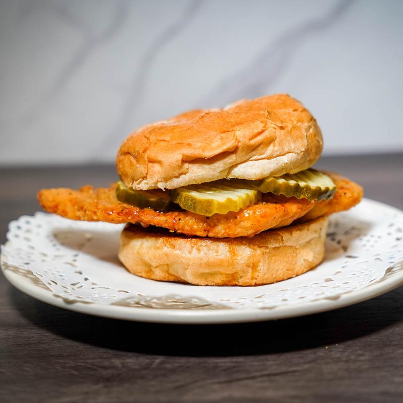 Deep fried chicken breast, hot honey and pickles on a grilled bulkie roll